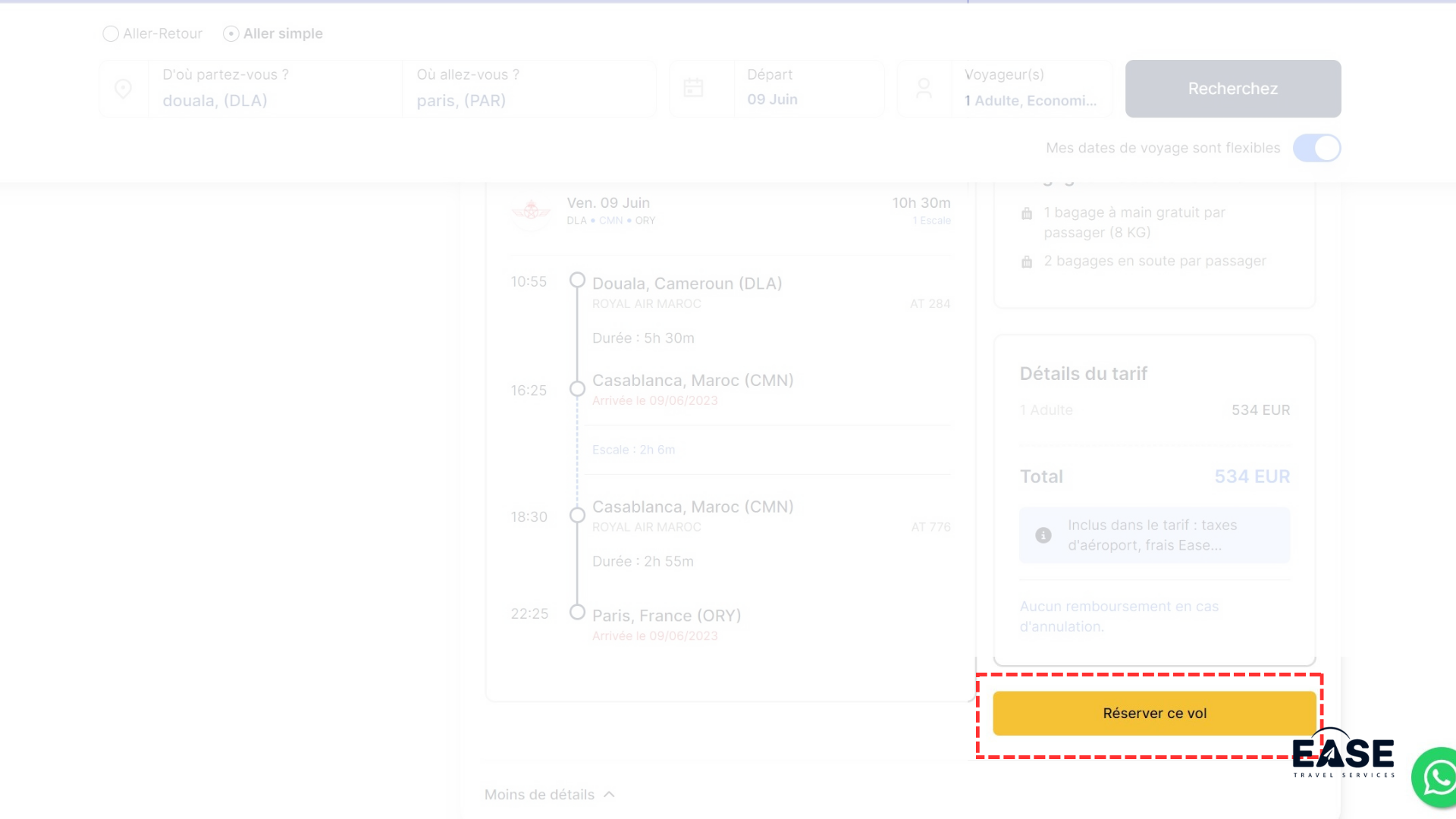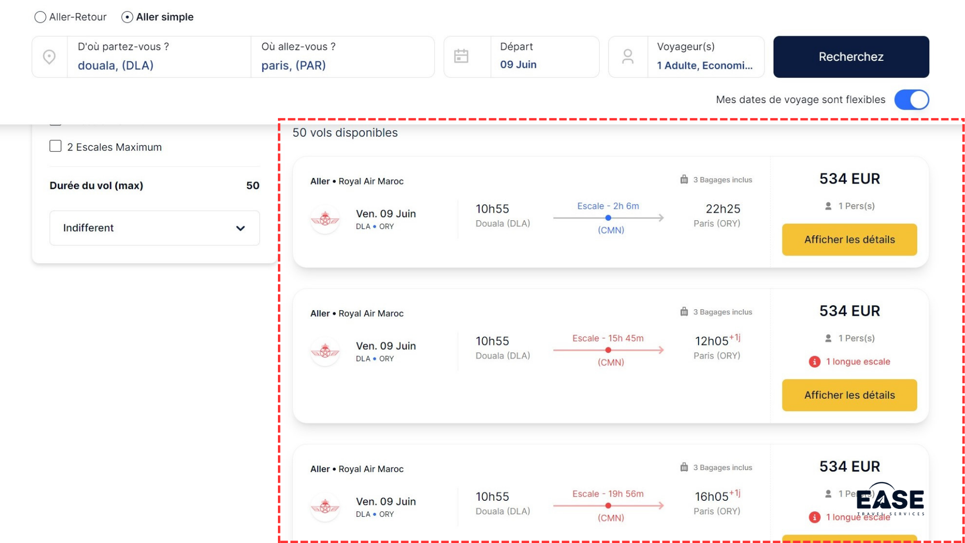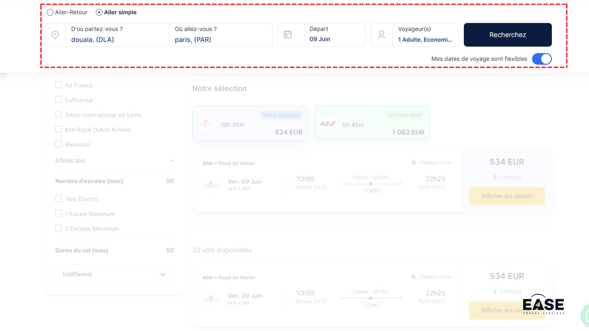 - Rendez-vous sur le site web ou l'application Ease Travel et entrez vos critères dans le moteur de recherche : ville de départ (Douala), ville d'arrivée (Paris), dates de voyage (par exemple du 9 au 16 juin 2023), nombre de passagers (par exemple 1 adulte).